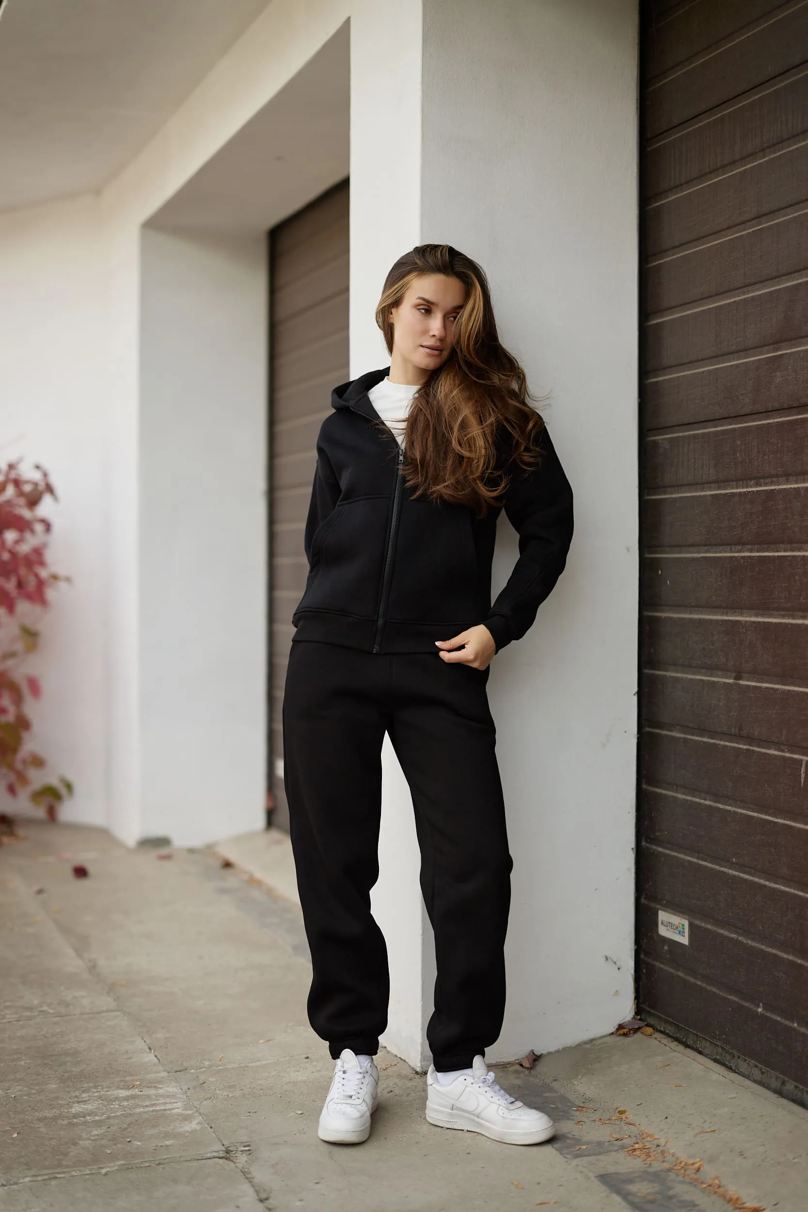 Базовий крій, підійде на будь-яку фігуру; худі на блискавці, джогери зі шнурком на поясі