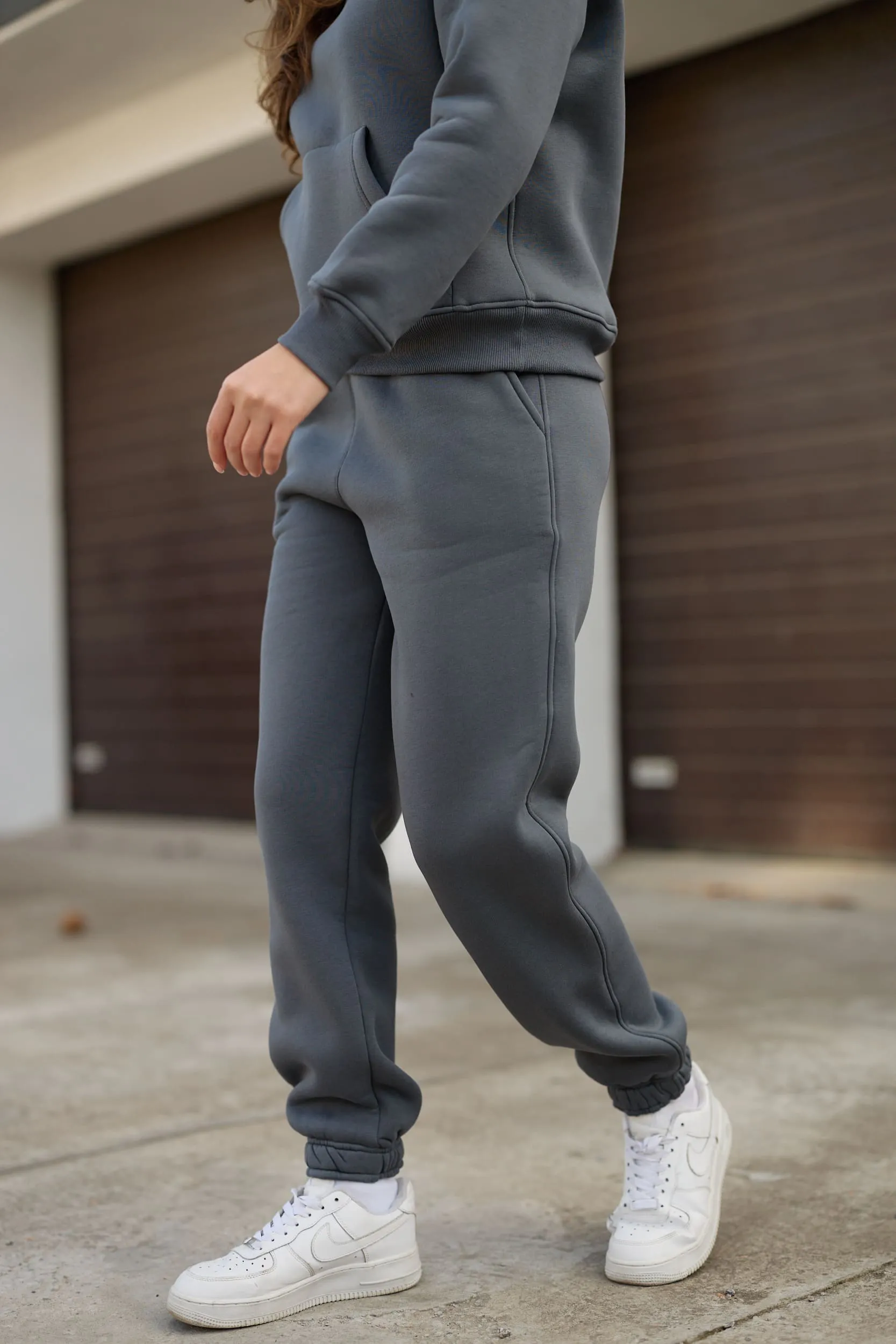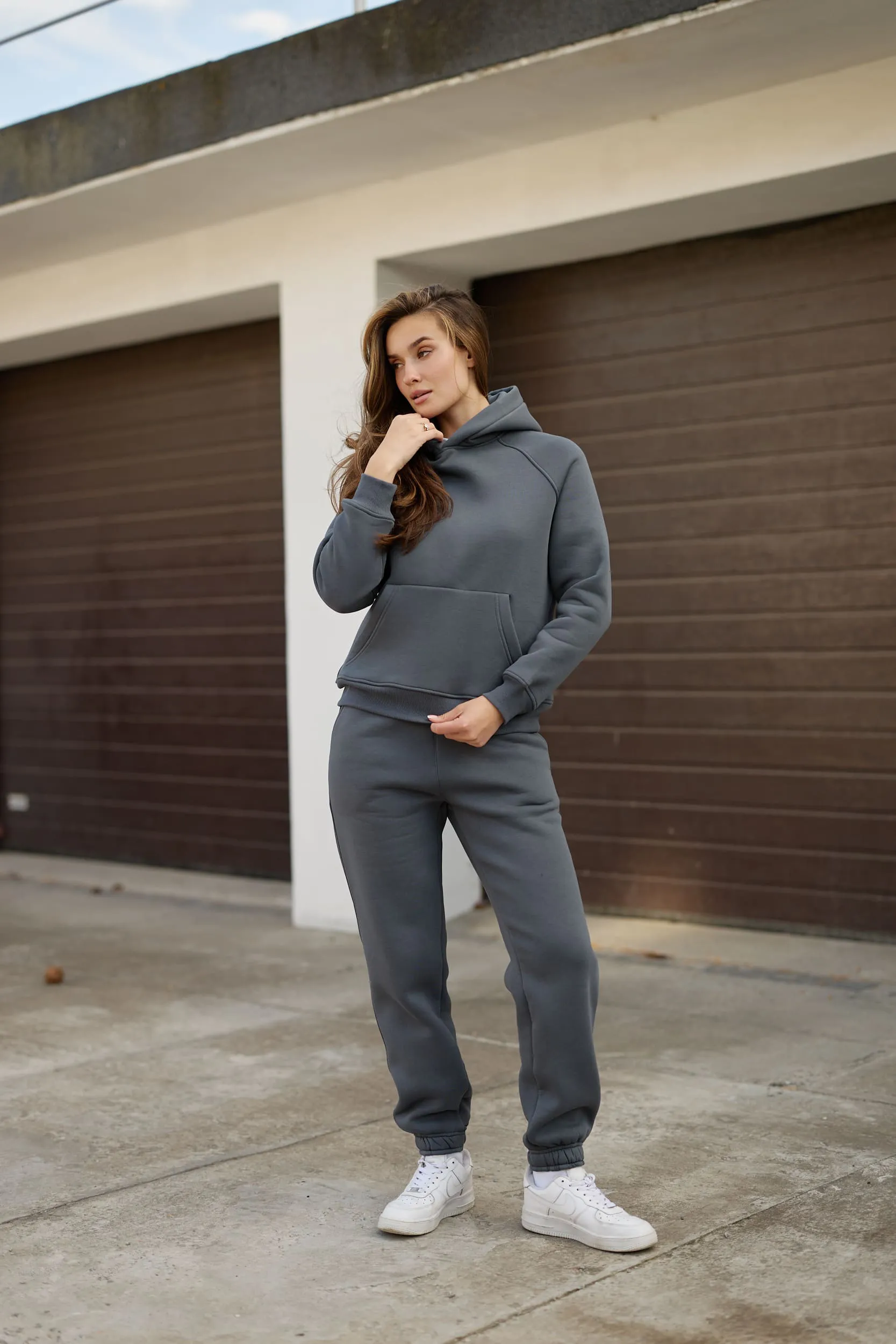 Базовий крій, підійде на будь-яку фігуру; худі з капюшоном, джогери зі шнурком на поясі