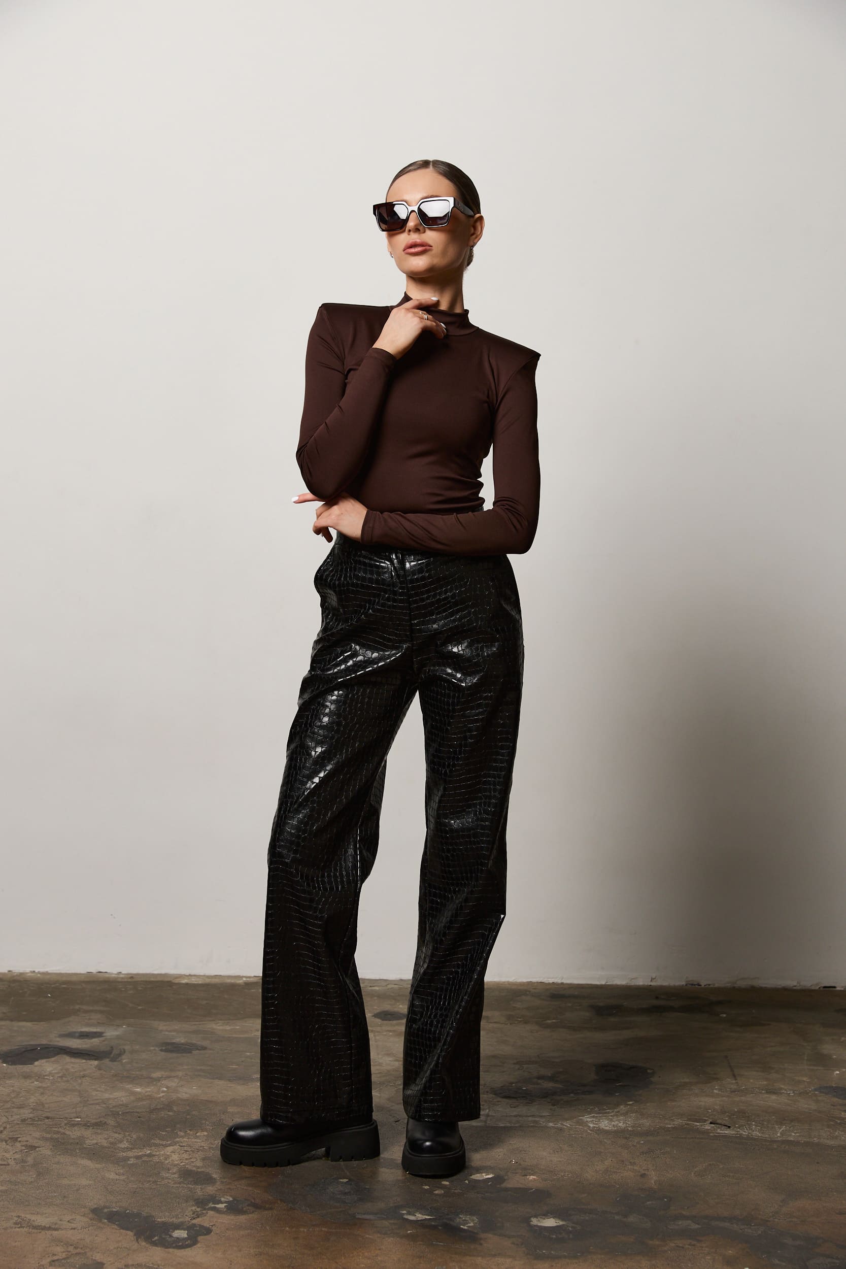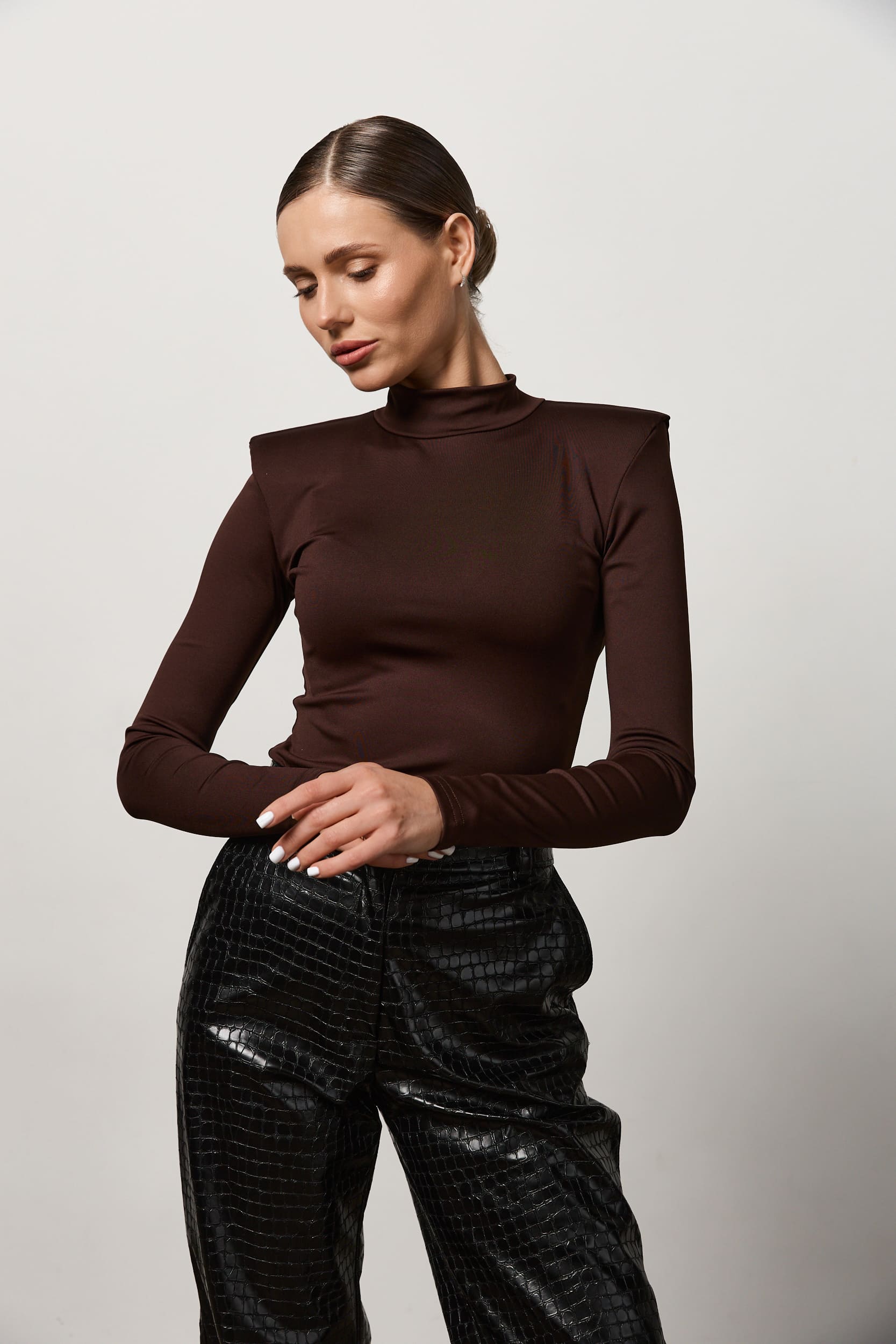 Лонгслів з акцентними плечима шоколад за вигідними цінами.