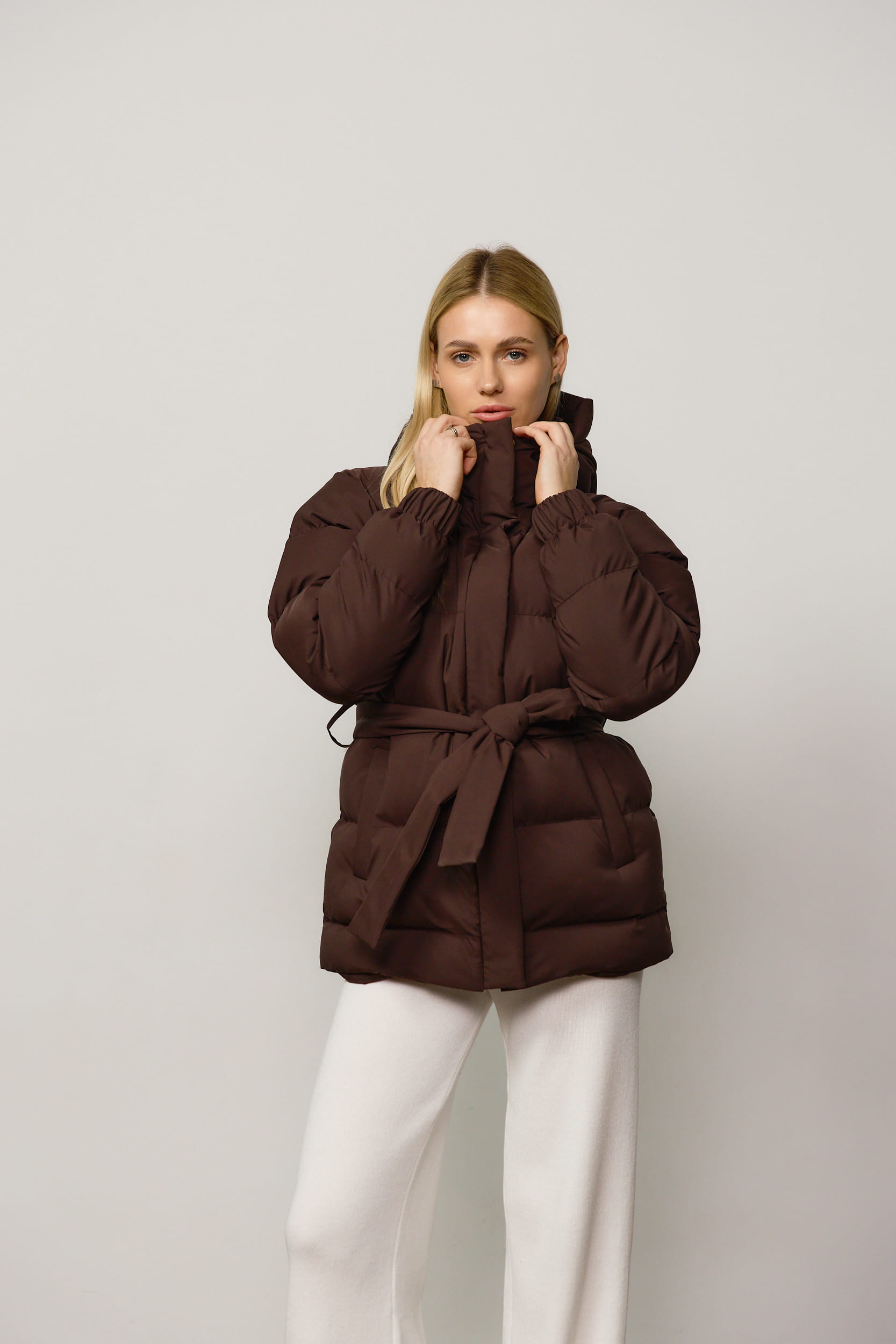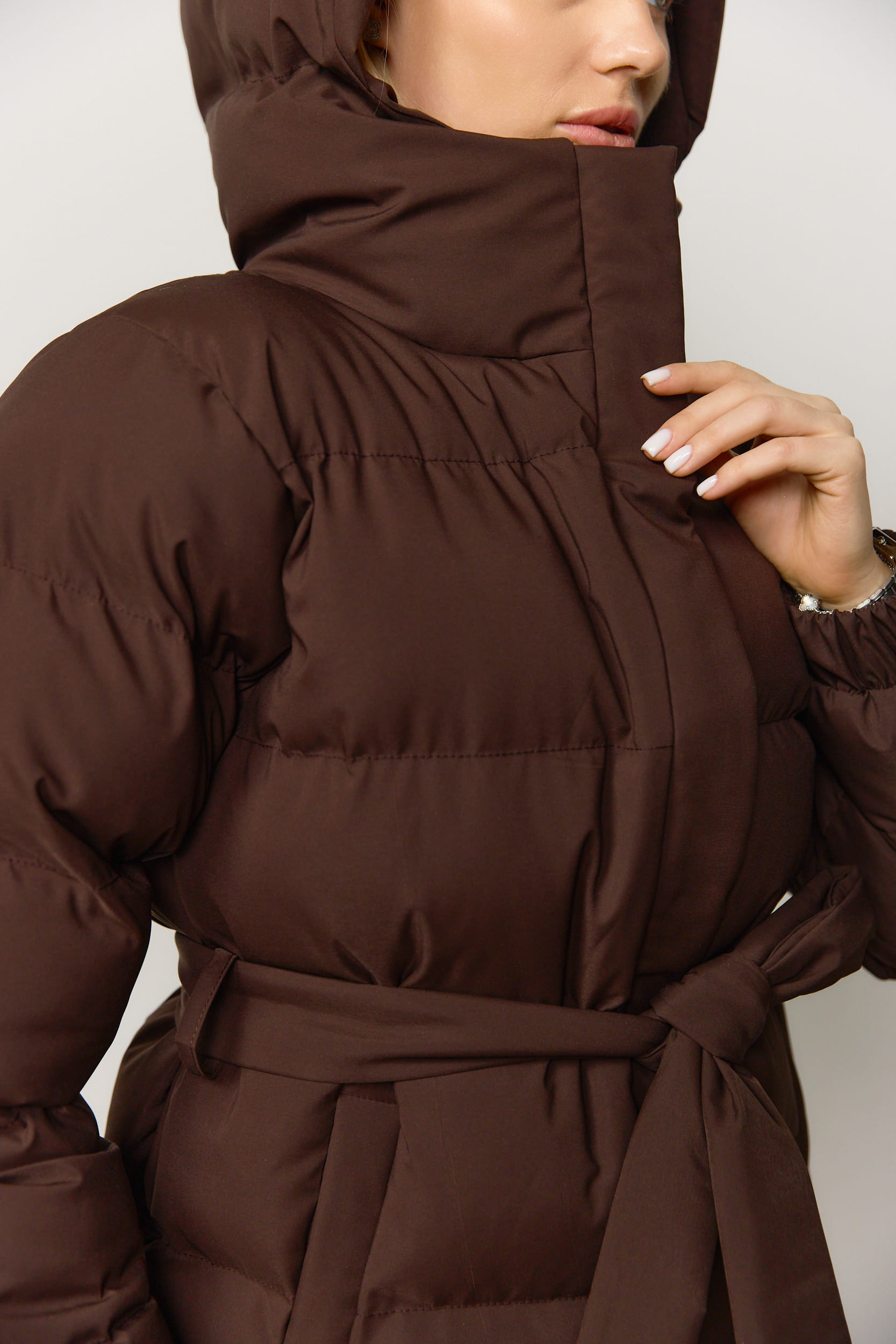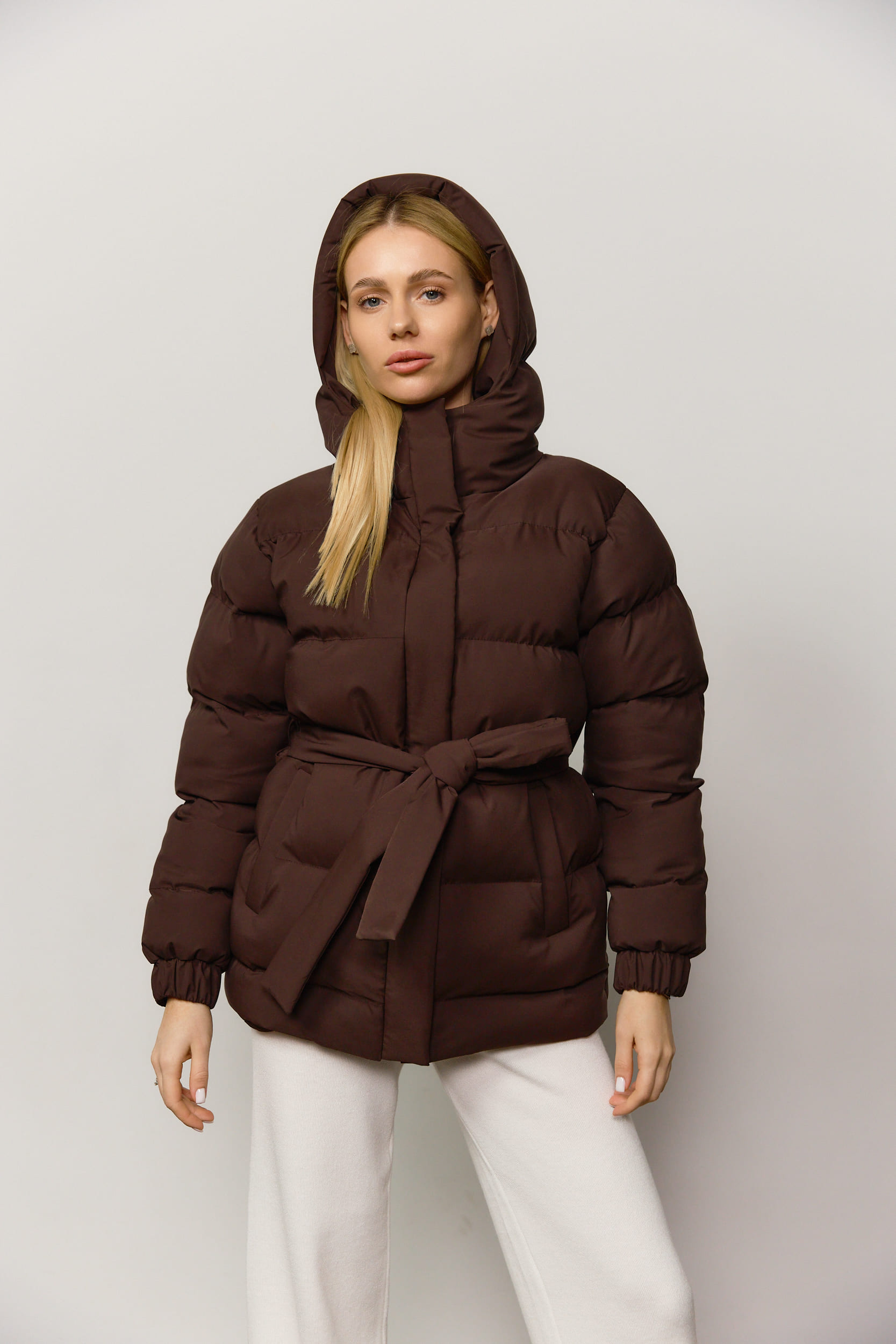 Пуховик з поясом матовий жіночий шоколад за вигідними цінами.