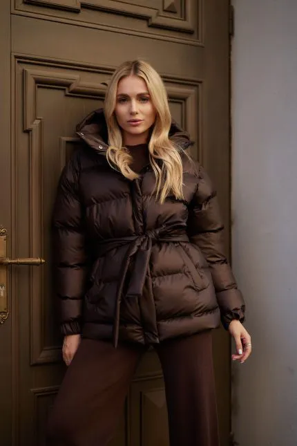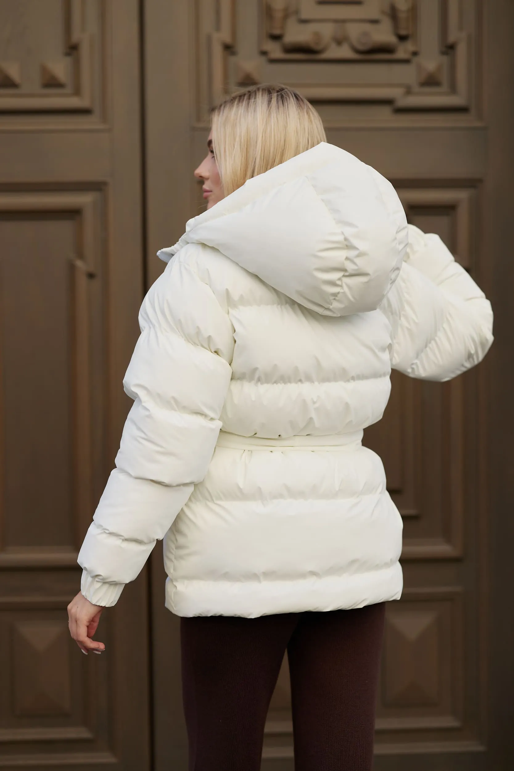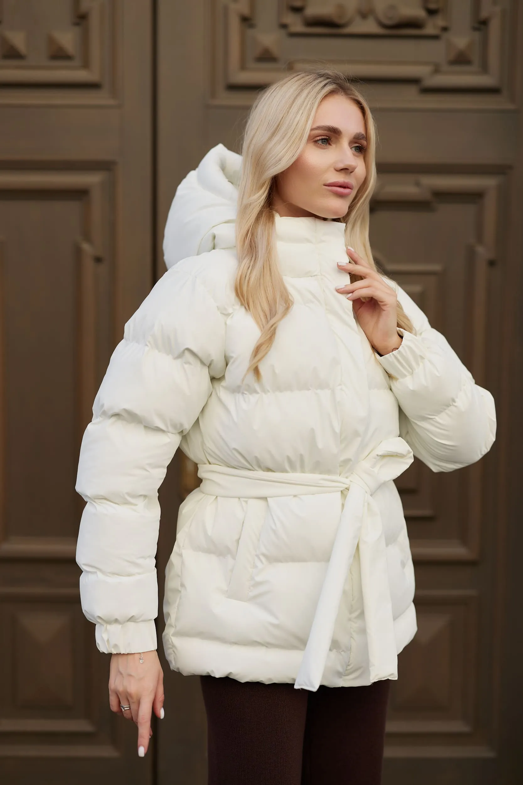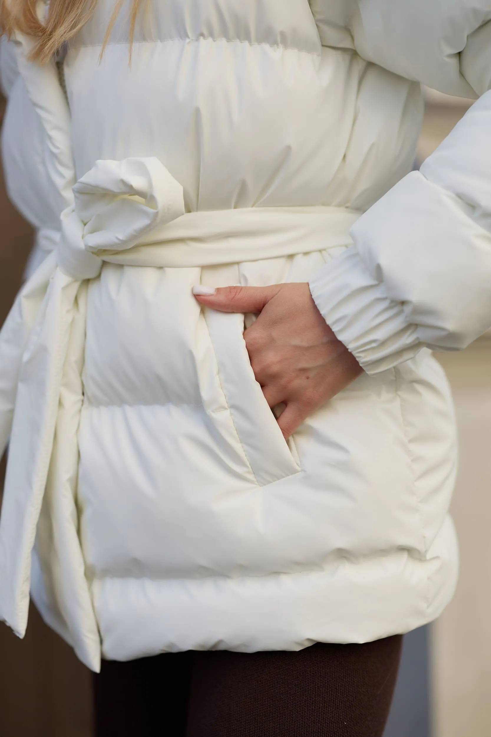 Пуховик з поясом жіночий молочний за вигідними цінами.